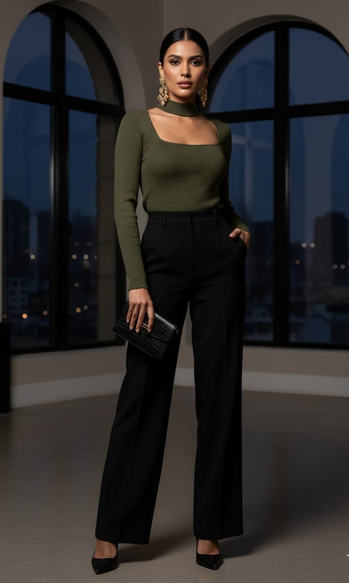 Atrévete a lucir el equilibrio perfecto entre elegancia moderna y atrevimiento. Este top de punto acanalado se ajusta a tu figura, destacando con su innovador cuello alto tipo choker y un favorecedor escote cuadrado.